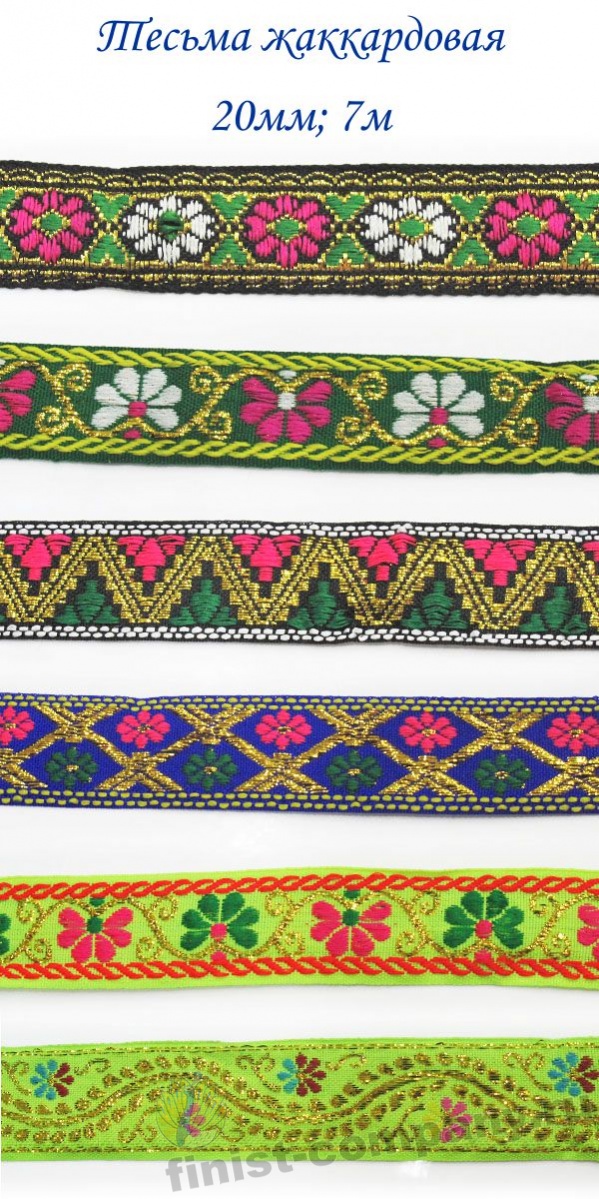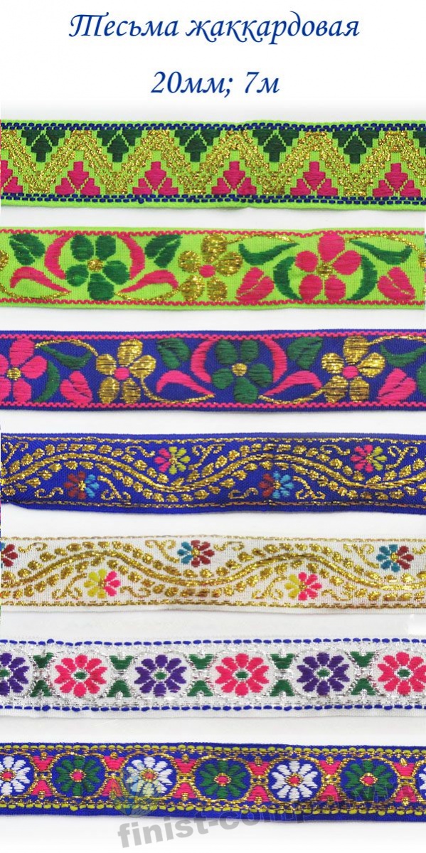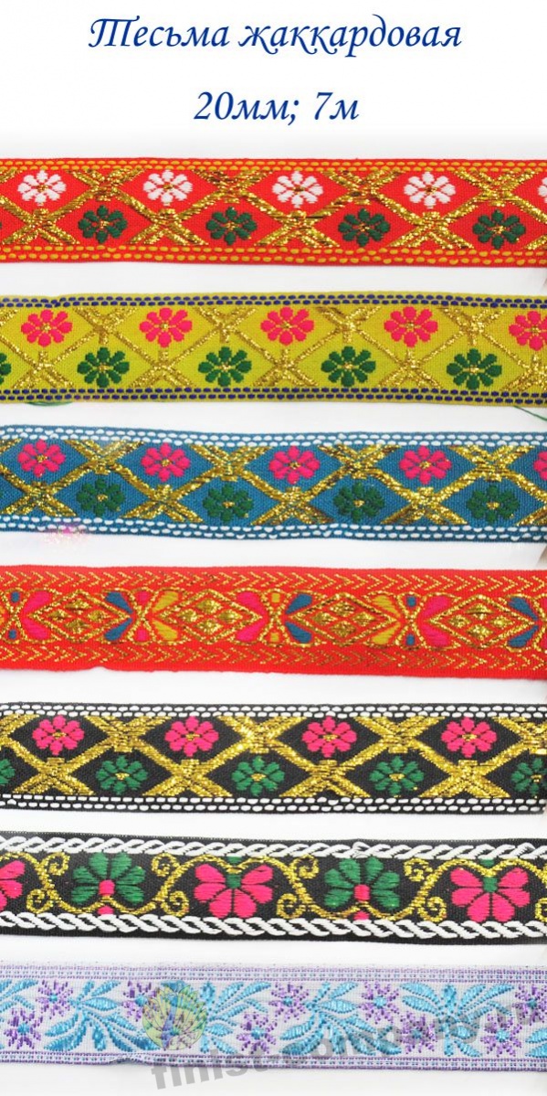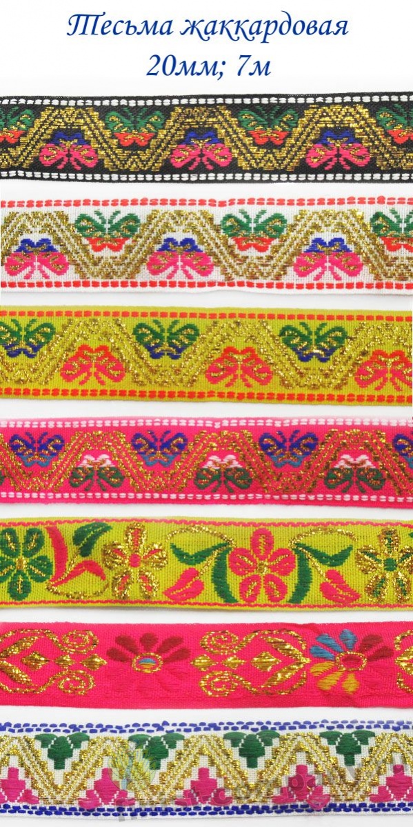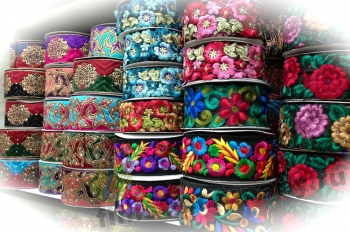 Тесьма жаккардовая - лента с крупным рисунком, который образован несколькими системами основных и уточных нитей и надежно вплетен в основу тесьмы при ее изготовлении. Следовательно рисунок с такой тесьмы никогда не сотрется и не поблекнет. Тесьма с таким орнаментом напоминает вышивку гладью, что придает