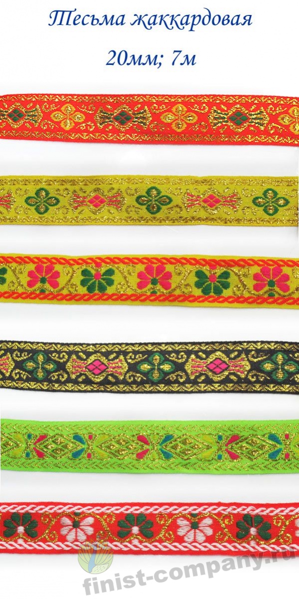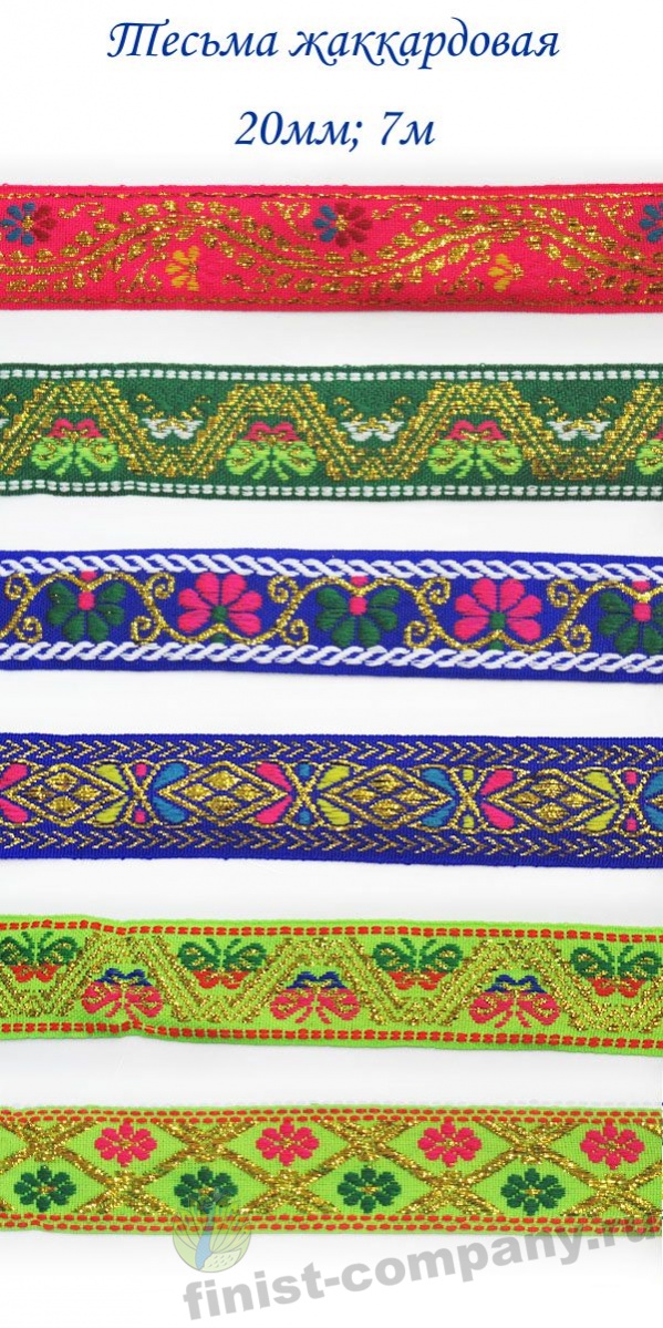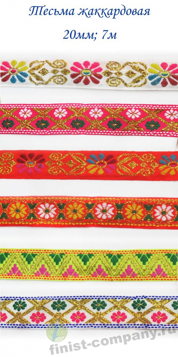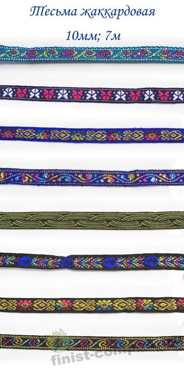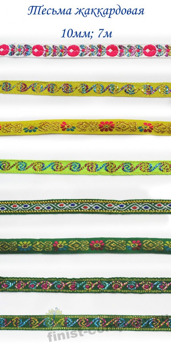 Тесьма жаккардовая - лента с крупным рисунком, который образован несколькими системами основных и уточных нитей и надежно вплетен в основу тесьмы при ее изготовлении. Следовательно рисунок с такой тесьмы никогда не сотрется и не поблекнет. Тесьма с таким орнаментом напоминает вышивку гладью, что придает